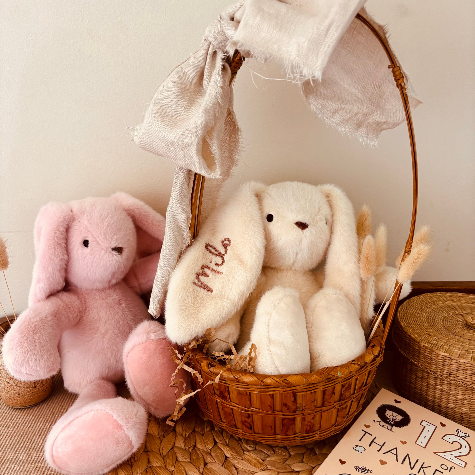 Soft, velvety plush bunnies lovingly hand embroidered in sage, blush or bronze premium threads.